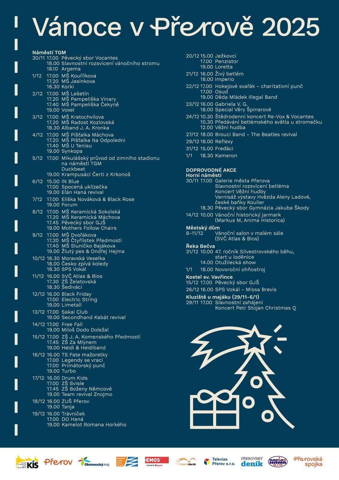 Rozsviť Přerov (Ostatní) Od 01.12.2025 16:00 do 24.12.2025 18:00 hod. Přerov, Přerov Od 1. 12. do 24. 12. se každý den v Přerově rozsvítí jedno velké číslo v některém významném subjektu či instituci. Každé ráno najdete na našem webu indicii a lokaci. V 16:00 se číslo rozsvítí a čeká vás překvapení – zpívání koled, svařák, dílničky a programy. | |