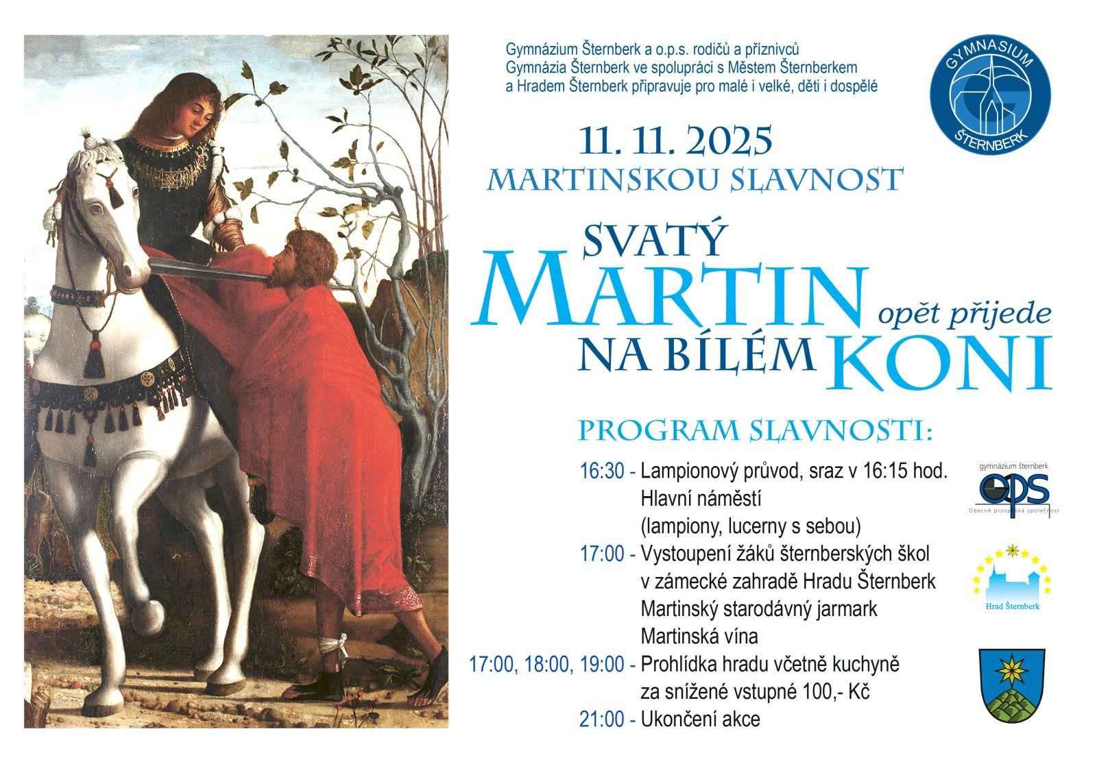 Akce pro veřejnost: Svatomartinská slavnost - Ostatní 11.11.2025 od 16:30 do 21:00 hod. Státní hrad Šternberk, Šternberk | Mapa Pracovníci a studenti Gymnázia Šternberk zvou všechny dne 11. 11. 2025 na Svatomartinskou slavnost, která začíná průvodem v 16:30 hodin z Hlavního náměstí a pokračuje bohatým kulturním programem na hradě Šternberk. Na slavnosti vystoupí žáci a studenti místních škol. V průběhu slavnosti si můžete zakoupit chutné výrobky našich studentů a také produkty ve stáncích. K dispozici bude i svatomartinské víno. V každou celou hodinu budou mít účastníci slavnosti možnost jít na prohlídku hradu za snížené vstupné.