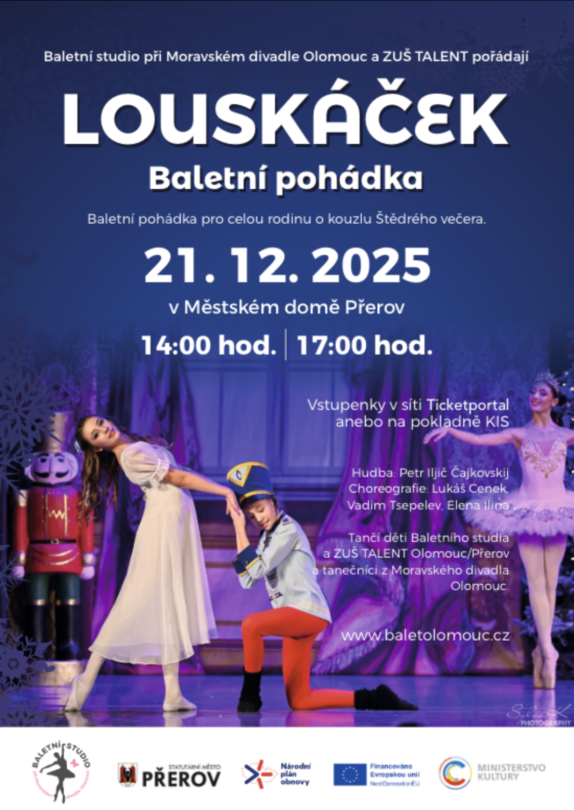 Louskáček - Divadlo 21.12.2025 od 14:00 do 19:00 hod. Městský dům Přerov, Přerov | Mapa Baletní pohádka pro celou rodinu, zatančí ji děti z Baletního studia při Moravském divadle Olomouc.