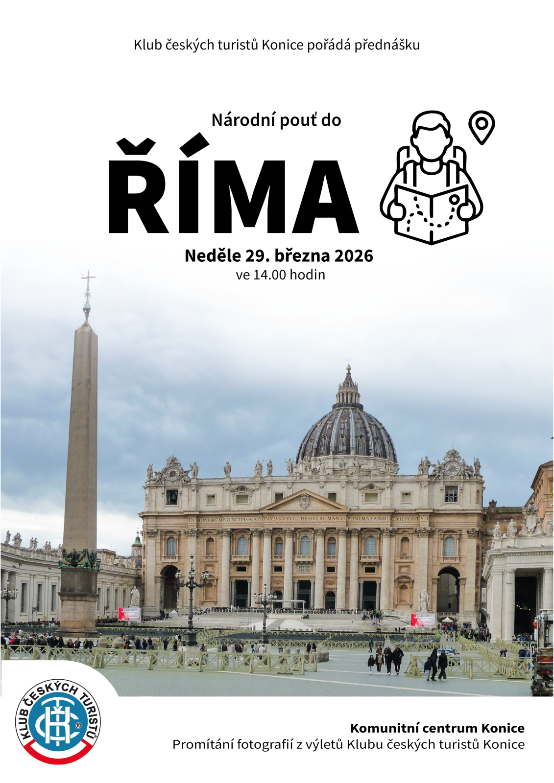 Národní pouť do ŘÍMA - Přednášky 29.03.2026 od 14:00 do 16:00 hod. Komunitní centrum Konice, Konice | Mapa Klub českých turistů Konice pořádá přednášku. Součástí bude i promítání fotografií z výletů KČT Konice.