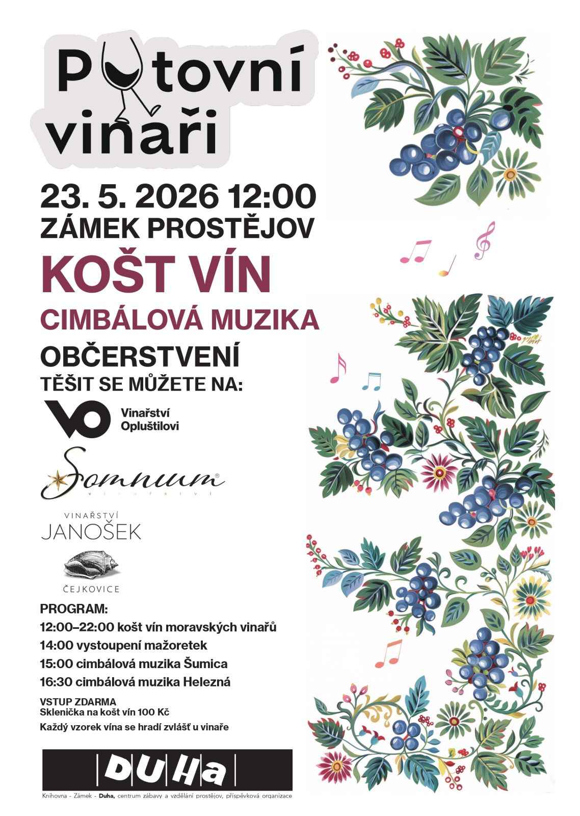 Putovní vinaři (Pod širým nebem / festivaly) 23.05.2026 od 12:00 do 20:00 hod. Zámek Prostějov, Prostějov | Mapa košt vín s cimbálovou muzikou | |
