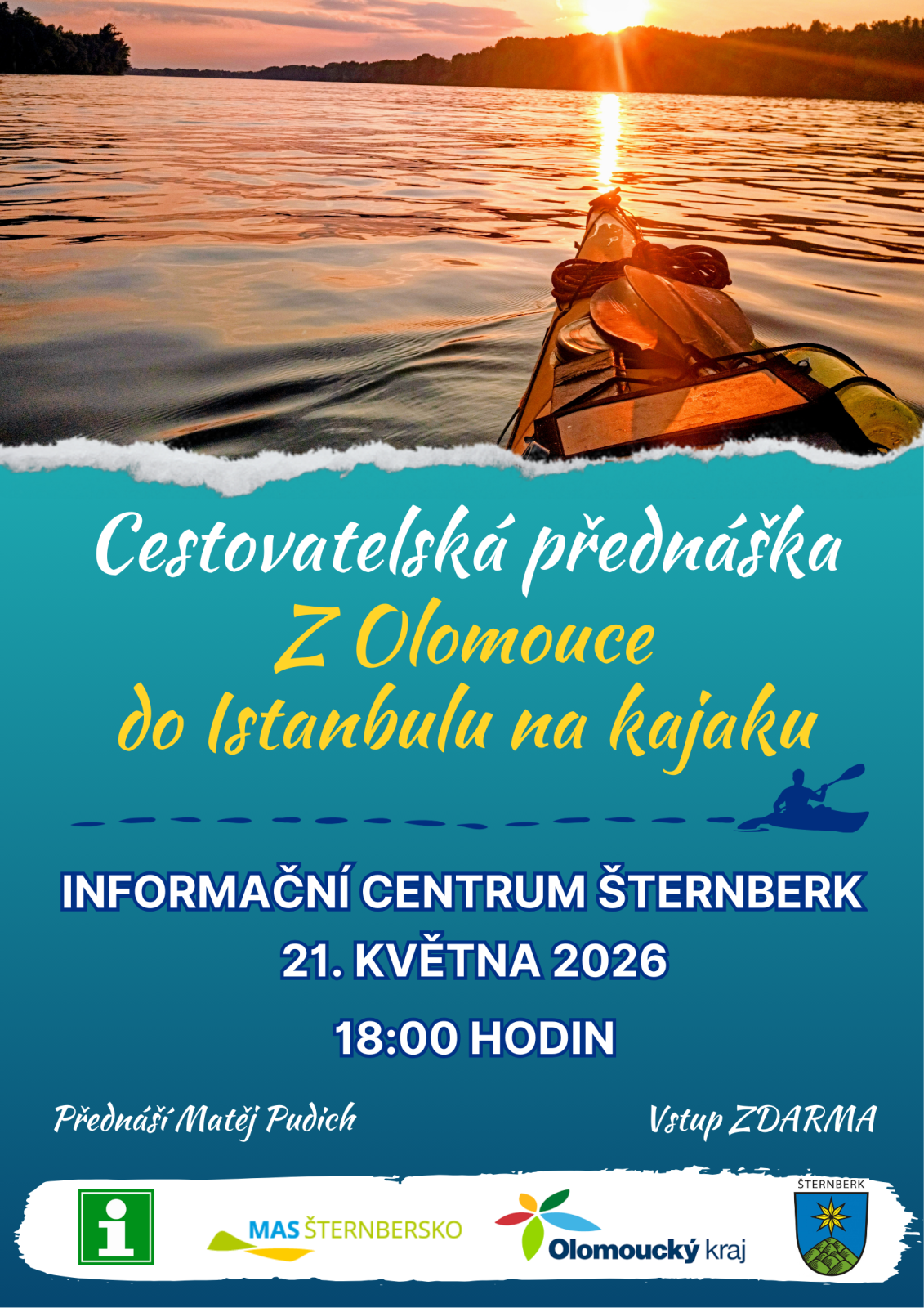 | 21.05.2026 od 18:00 do 20:00 hod. Informační centrum Šternberk, Šternberk Informační centrum Šternberk zve všechny zájemce o cestování a dobrodružství na cestovatelskou přednášku s názvem Z Olomouce do Istanbulu na kajaku. Matěj Pudich ujel celkem 3000 kilometrů přes 9 států, 3 hlavní města, 2 řeky, 1 moře, a to vše na 1 kajaku. |