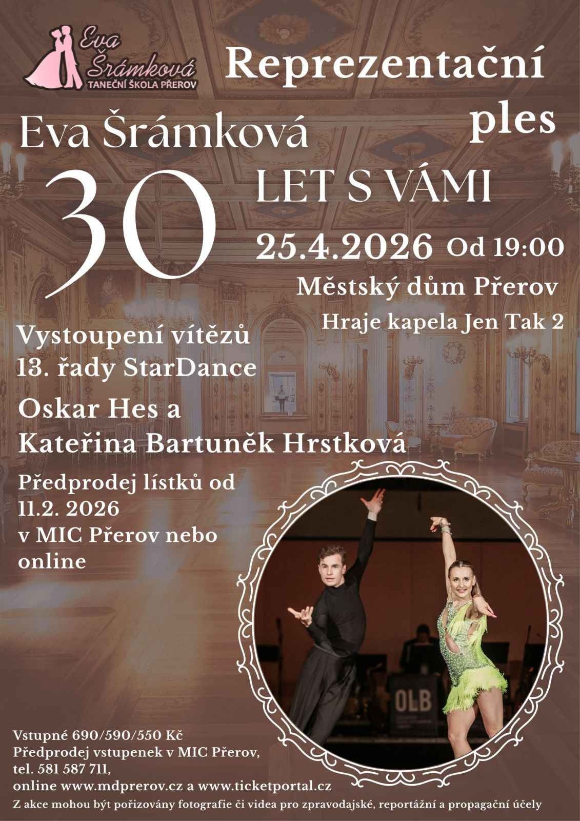 Reprezentační ples Taneční školy: 30 let s vámi - Taneční akce Od 25.04.2026 19:00 do 26.04.2026 02:00 hod. Městský dům Přerov, Přerov | Mapa Reprezentační ples Taneční školy Eva Šrámková, hraje skupina Jen Tak 2, vystoupení vítězů 13. řady StarDance.