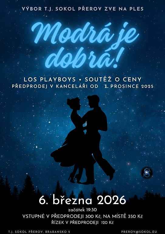 Sokolský ples - Taneční akce Od 06.03.2026 19:30 do 07.03.2026 02:00 hod. Přerov, Přerov | Mapa Ples na téma „Modrá je dobrá“. Hraje kapela Los Playboys, Sokolovna Přerov.