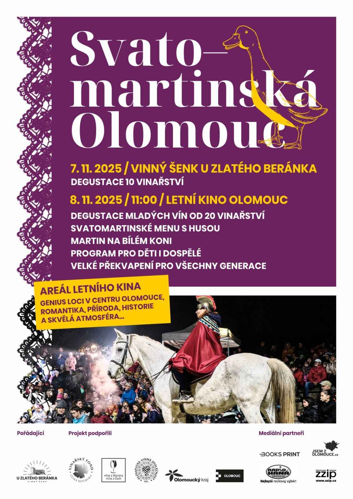 Svatomartinská Olomouc - Ostatní 08.11.2025 od 11:00 do 23:00 hod. V sobotu 8. listopadu od 11 hodin se oslavy přesunou do areálu Letního kina Olomouc, který nabídne prostorné zázemí, pódium i amfiteátr. Na návštěvníky čeká 20 vinařství z celé Moravy, degustace mladých vín ročníku 2025, bohatý doprovodný program a zázemí pro rodiny s dětmi. Děti si užijí opékání svatomartinských špekáčků, tvořivé dílničky i příjezd Martina na bílém koni. Pro dospělé bude připraveno svatomartinské menu, svatomartinské pivo a vyvrcholení večera nabídne ohňovou show skupiny Krampus Arteris a koncert Cimbál Hallbend s novým repertoárem v amfiteátru.