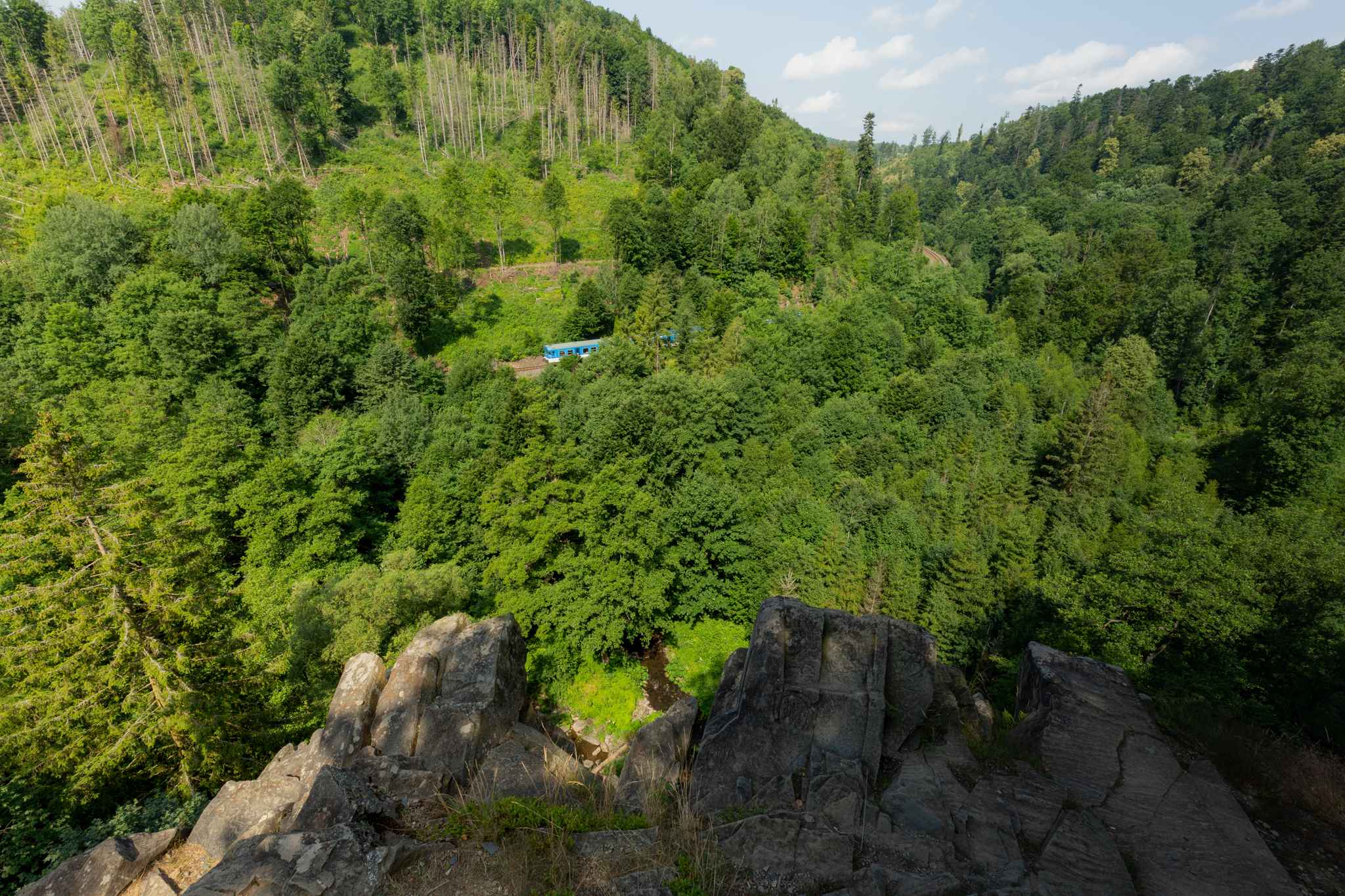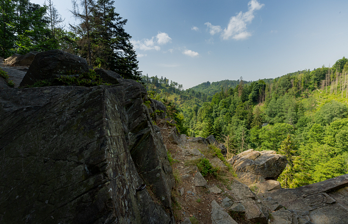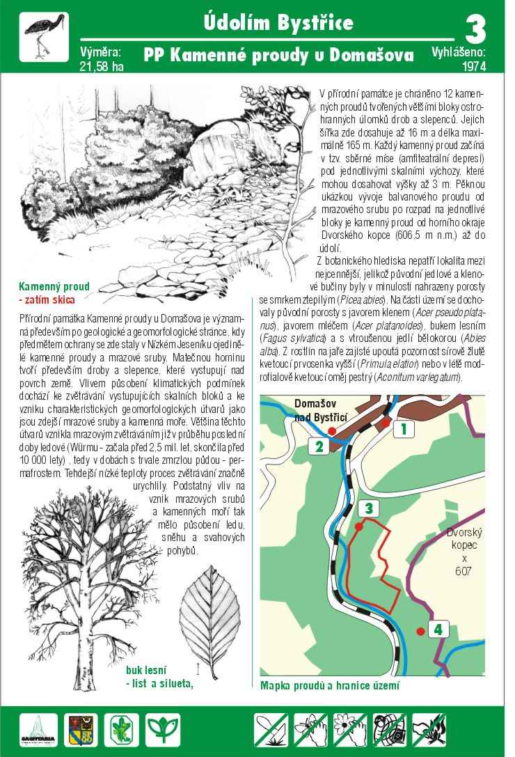 Stezka vede jedním z nejmalebnějších údolí, netvoří okruh, vede po modré značce mezi železničními stanicemi Domašov nad Bystřicí a Hrubá Voda, měří 13 km. Vydejte se na dobrodružnou výpravu podél řeky Bystřice, která se klikatí hlubokým údolím Nízkého Jeseníku. Na 13 kilometrech mezi Domašovem nad Bystřicí a Hrubou Vodou vás čeká 11 zastavení s informacemi o přírodě, geologii a historii krajiny kolem údolí Bystřice. Nejoblíbenější je čtyřkilometrový úsek mezi železničními zastávkami Jívová – Hrubá Voda – Smilov, kde údolí překvapuje svou divokostí. Cesta vede kolem skalních ostrohů, kamenných moří a sutí, které jsou pozůstatkem dávných geologických procesů. Nejzajímavějšími místy na trase jsou Kamenné proudy u Domašova, které vznikly v poslední době ledové a přírodní rezervace Hrubovodské sutě – domov ohrožených druhů rostlin a živočichů. Díky železniční trati Olomouc – Krnov, která prochází údolím, můžete kombinovat pěší výlet s vlakovou dopravou. Na kole stezku zvládnou jen zdatnější cyklisté – některé úseky jsou kamenité, úzké a vyžadují zkušenost s jízdou v obtížném terénu. V několika místech může být nutné kolo krátce vést.