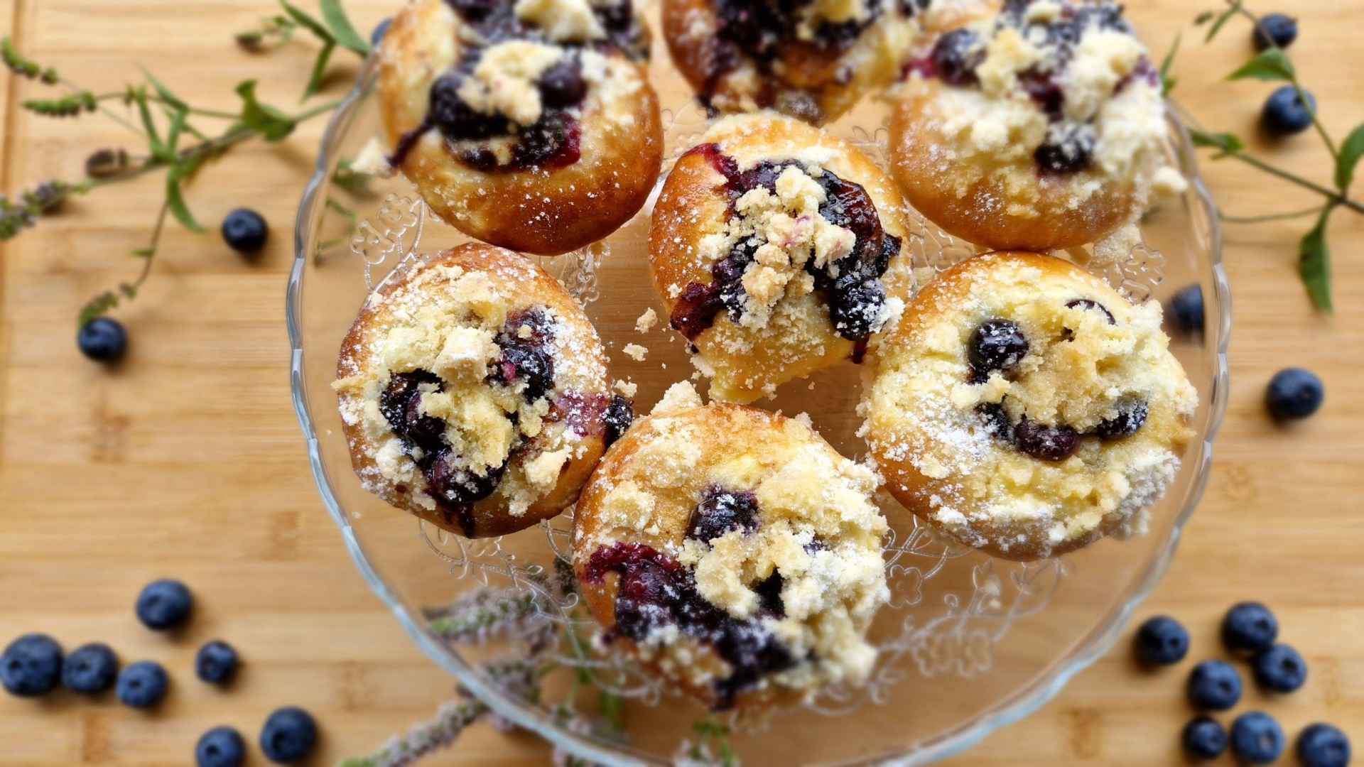 In einer Schüssel die Hefe mit etwas Mehl, Zucker (Zucker fördert die Gärung) und lauwarmer Milch (wenn Sie die Milch aus dem Kühlschrank genommen haben, erwärmen Sie sie in einem Kochtopf) vermengen. Decken Sie die Schüssel mit einem Geschirrtuch ab, stellen Sie sie für etwa 15 Minuten an einen wärmeren Ort und lassen Sie die Vorspeise aufgehen. Trennen Sie das Eiweiß von den Eigelben. Das Mehl in eine Schüssel geben, Salz und Zucker hinzufügen und verrühren. Dann den Sauerteigstarter, das Öl, die Eigelbe und die Milch hinzufügen. Zu einem glatten Teig verarbeiten und eine halbe Stunde lang gehen lassen. Die Quarkfüllung zubereiten: Hüttenkäse, Zucker, Ei und Zitronenschale in einer Schüssel glatt rühren. Die Streusel zubereiten: In einer Schüssel das Mehl, den Zucker und die Butter vermischen und die Streuselmischung zubereiten. Den Teig auf ein bemehltes Nudelholz geben und in gleiche Teile teilen. Die Hüttenkäsefüllung zu Teigtaschen formen, 3 Blaubeeren dazugeben und zu Laiben formen. Die Brote auf Backpapier legen, eine Vertiefung eindrücken und eine Weile gehen lassen (etwa 15 Minuten). Dann mit Ei bestreichen. Die Marmelade und 4 Blaubeeren in die Vertiefung geben. Mit Streuseln bestreuen und backen. Im vorgeheizten Backofen bei 180°C etwa 10-15 Minuten backen. |