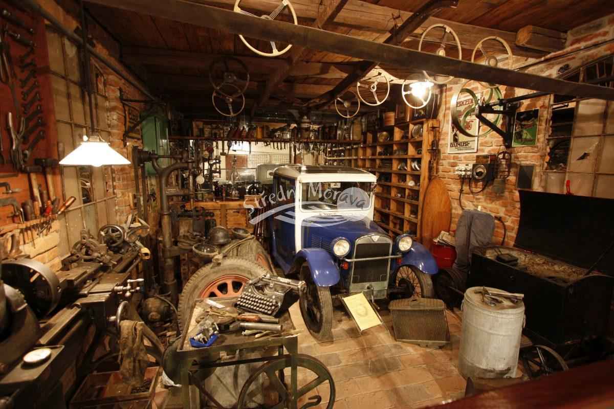 Die ausgestellten Autos und Motorräder sind größtenteils voll fahrbereit. Es gibt eine historische Kulisse von Olomouc, eine Autowerkstatt mit einer Zapfsäule aus dem frühen 20. Jahrhundert und eine Scheune mit einem unter Stroh gelagerten Oldtimer. In den Vitrinen sind Modellautos, historische Werkzeuge und Beispiele für alte Automobiltechnik zu sehen. Weiter geht es zur Zdeněk-Burian-Galerie auf dem Gelände des Kurortes Slatinice oder zum Velký Kosíř, auf dessen Gipfel sich ein moderner Aussichtsturm befindet.