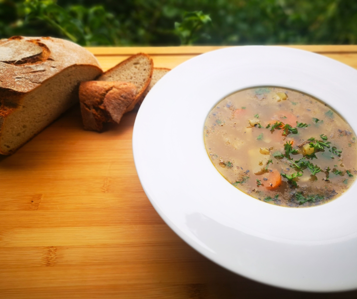 Clean your potatoes, onions, carrots, a piece of celery and parsley. Cut everything into cubes. Put the butter in a saucepan and once it has melted, add the onions and fry until golden. Dust with flour and prepare the roux. Make sure it doesn't burn. Pour in the water and add the potatoes and root vegetables, dried mushrooms and season with spices and salt. Cook until the ingredients are soft. Once the ingredients are soft, add the marjoram and garlic and boil for a little longer. To soften the taste, you can add more cream. |