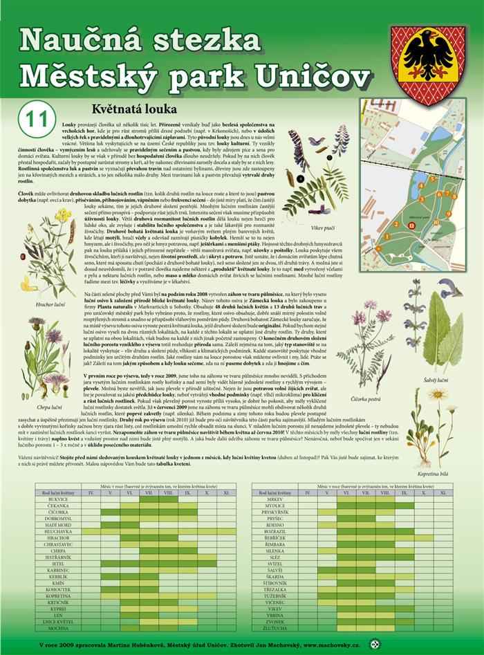 The starting point of the nature trail is on Sadová Street, about a seven-minute walk from the centre of Uničov. The trail leads along sidewalks and is therefore also suitable for walking with a stroller or for wheelchair users. The stops along the trail will introduce you to the local flora and fauna, and part of the trail is also dedicated to the Oskava River, which flows through the city park itself. The trail is 1 km long, and refreshments are available along the way .