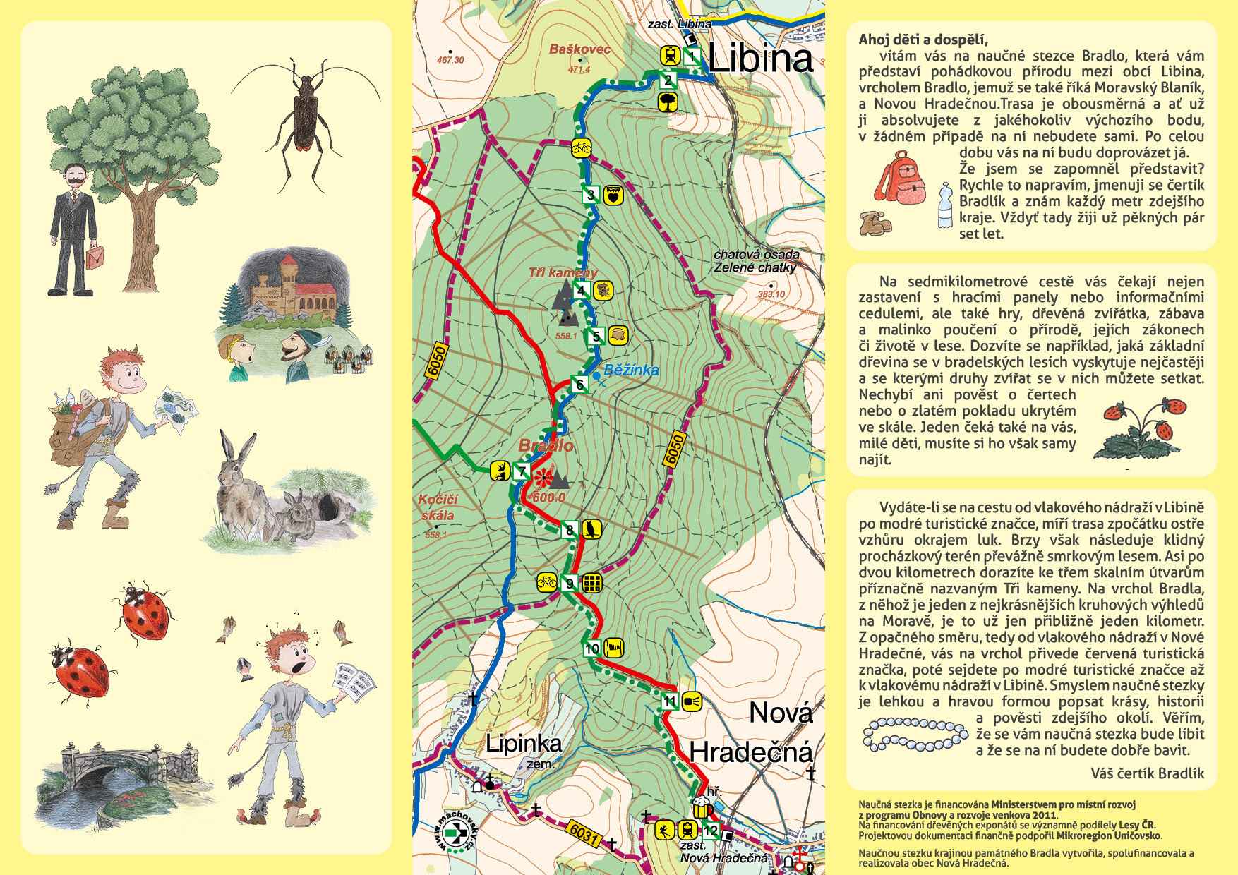 The longer version of the route leads from the Jeseníky Mountains from the village of Libina (railway station), where the starting point of the nature tra il is located, and continues through the Three Stones, Bradlo and ends in the village of Nová Hradečná. Information panels and interactive elements are placed along the trail. The trail is 6.9km long .